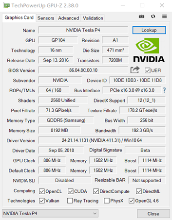 我们知道,Tesla P4原本是用于服务器环境下的GPU,没有设计显示输出,因此不能直接连接显示器进行游戏。有同学可能就会说了,没有输出接口,我们给他焊一个上去不就行了?是的,理论上是可以的,实际上也是可以的,毕竟核弹都可以用算盘打出来:)。先来看看,我们的Tesla P4信息是怎样的,如下图
