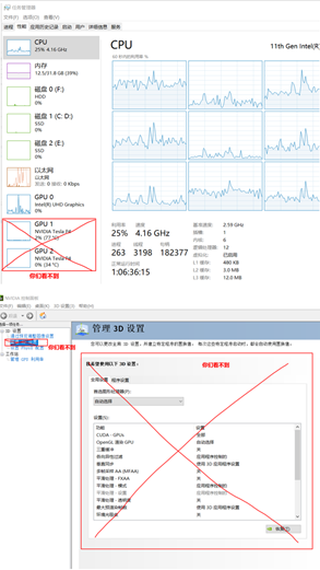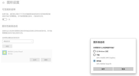 打开任务管理器和Nvidia控制面板,可以看到,除了核显,我们是看不到插在主机上的Tesla P4的,并且在Nvidia控制面板中,也无法设置P4用于游戏运算。